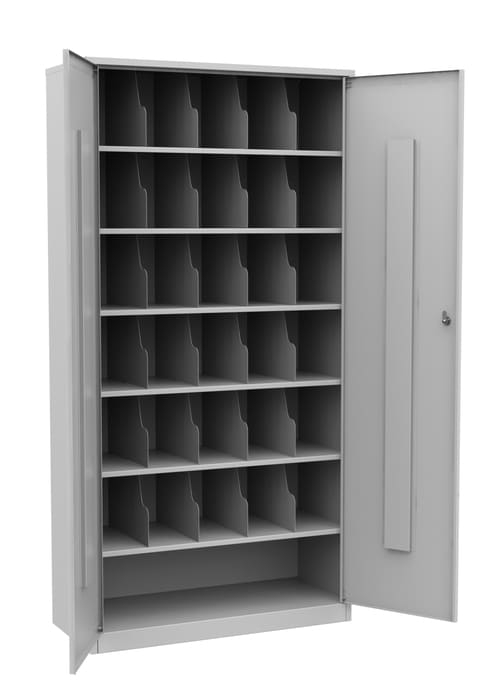 Функциональный шкаф для хранения средств индивидуальной защиты с продуманной компоновкой: 30 скошенных ячеек обеспечивают удобное размещение противогазов, а свободная нижняя ниша (высота 221 мм) позволяет дополнительно хранить сумки, фильтры или другое сопутствующее оборудование.
