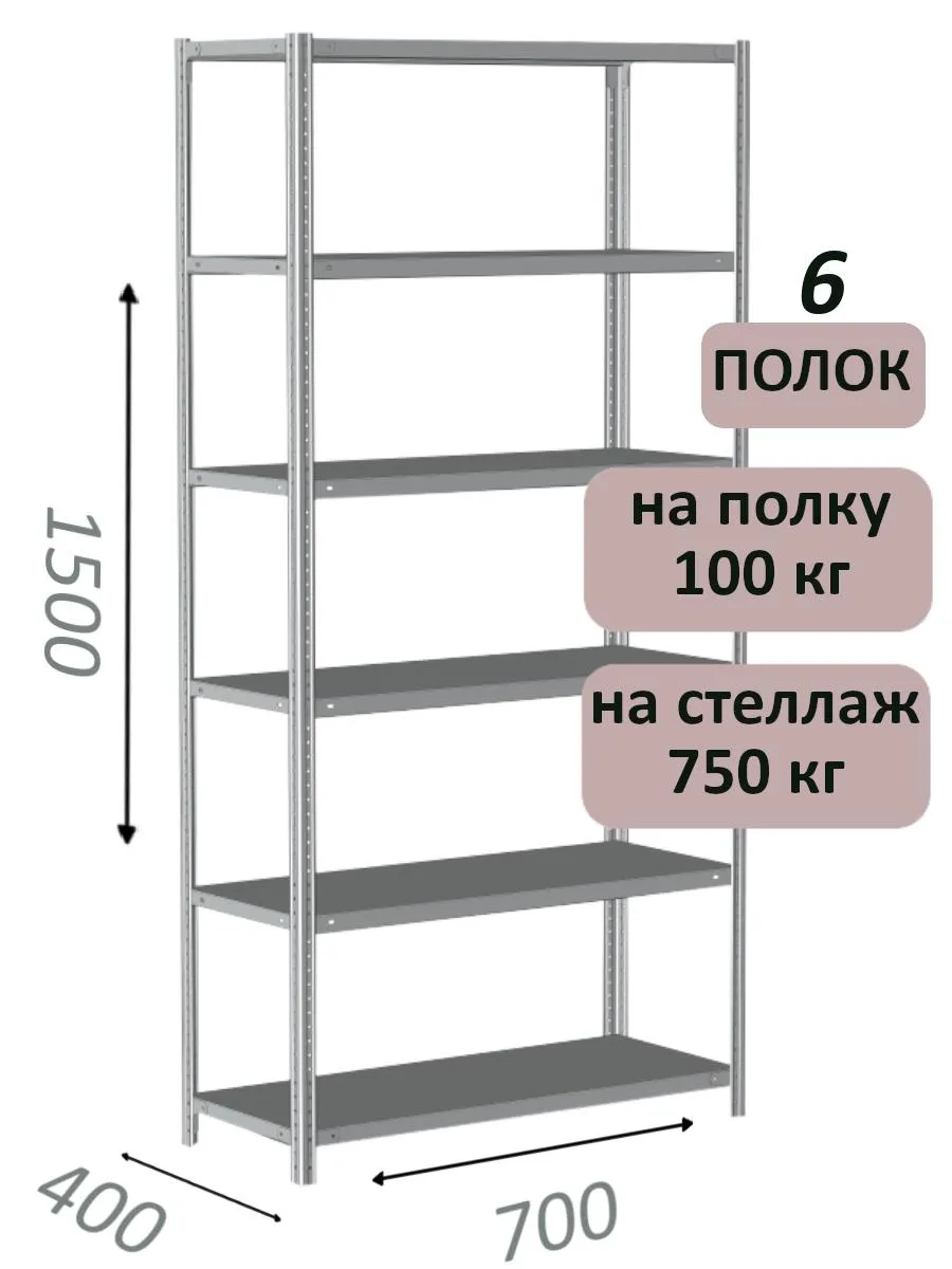 Стеллаж металлический полочный МС 1500х700х400, 6 полок, 100 кг на полку, светло-серый