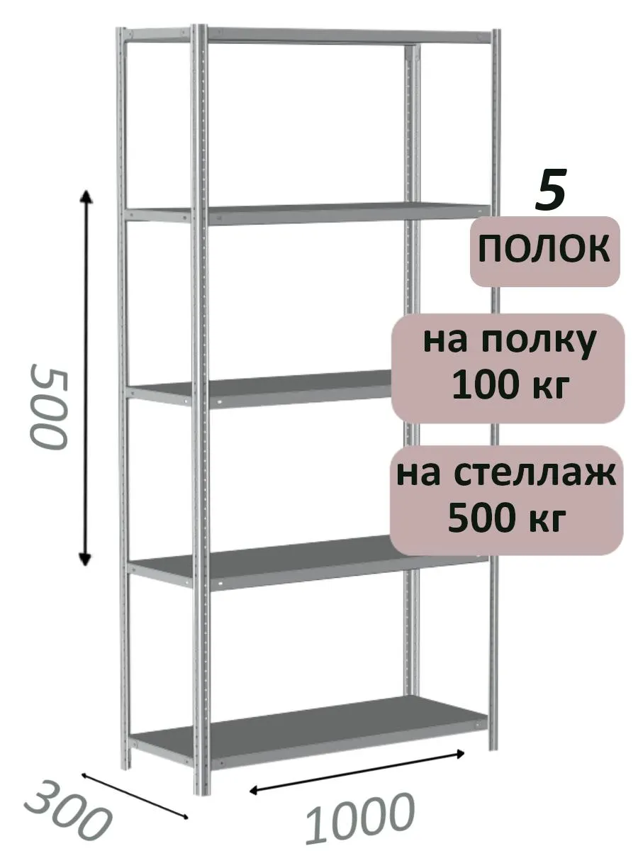 Стеллаж металлический полочный МС-500 500х1000х300, 5 полок, светло-серый