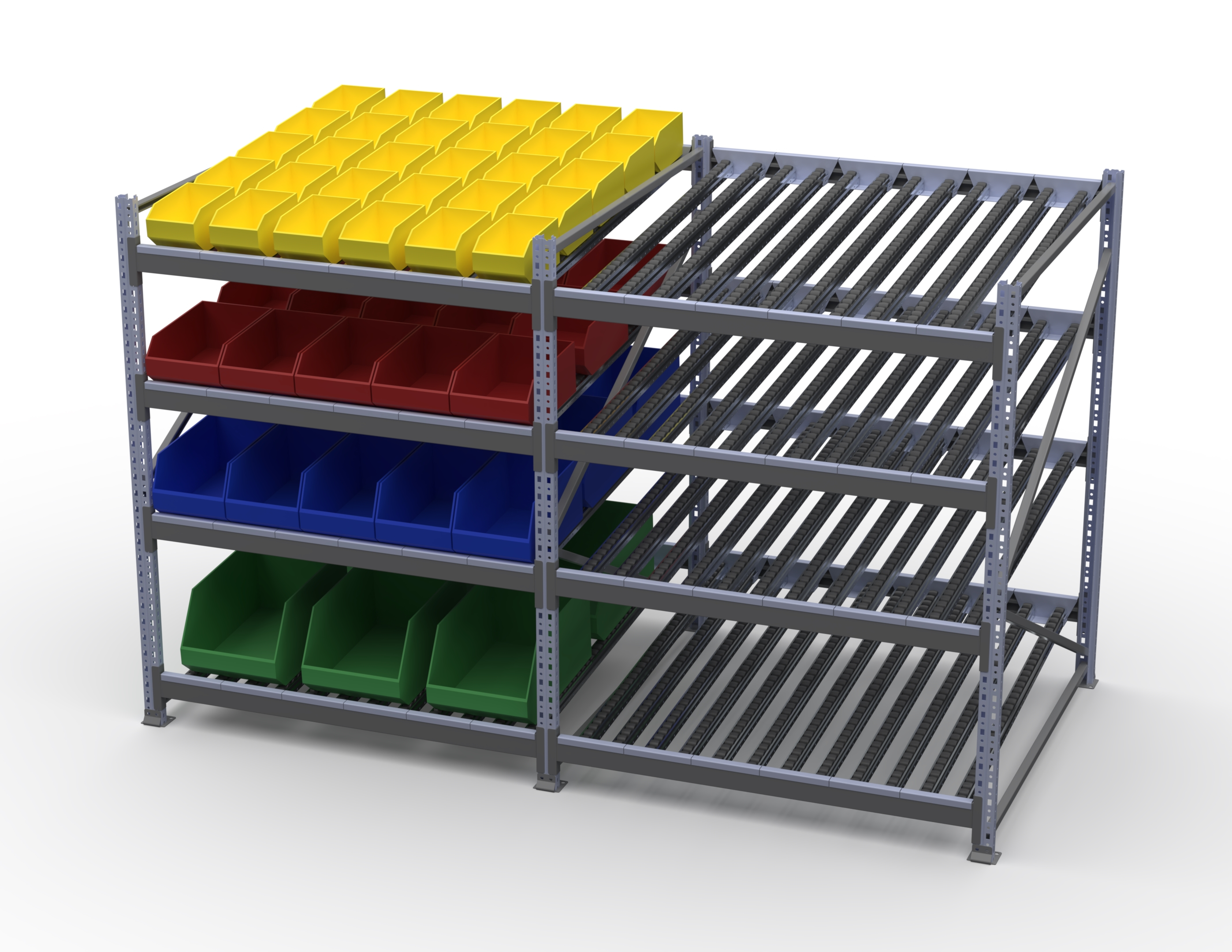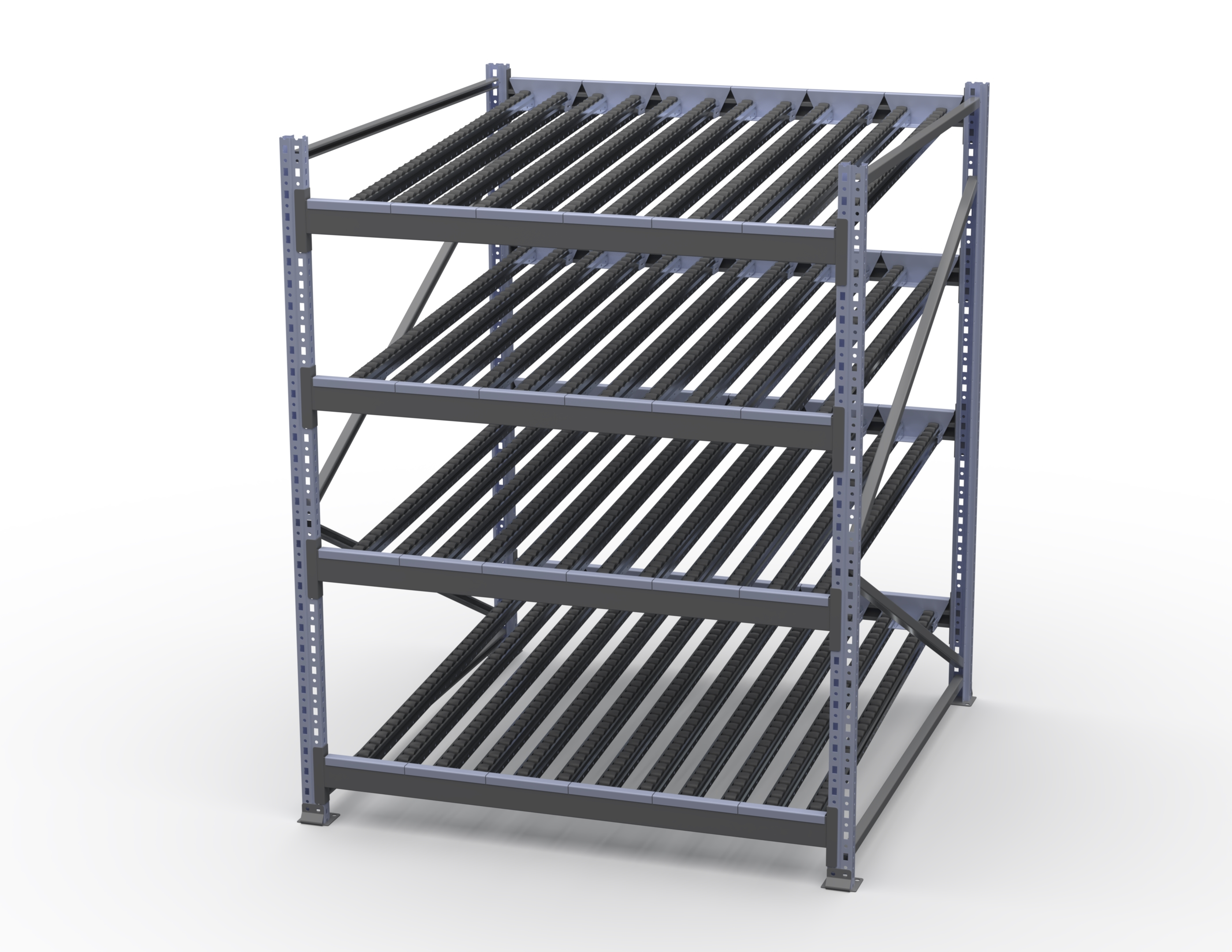 Гравитационный стеллаж с роликовыми полками 1600х1200х1300, 4 яруса