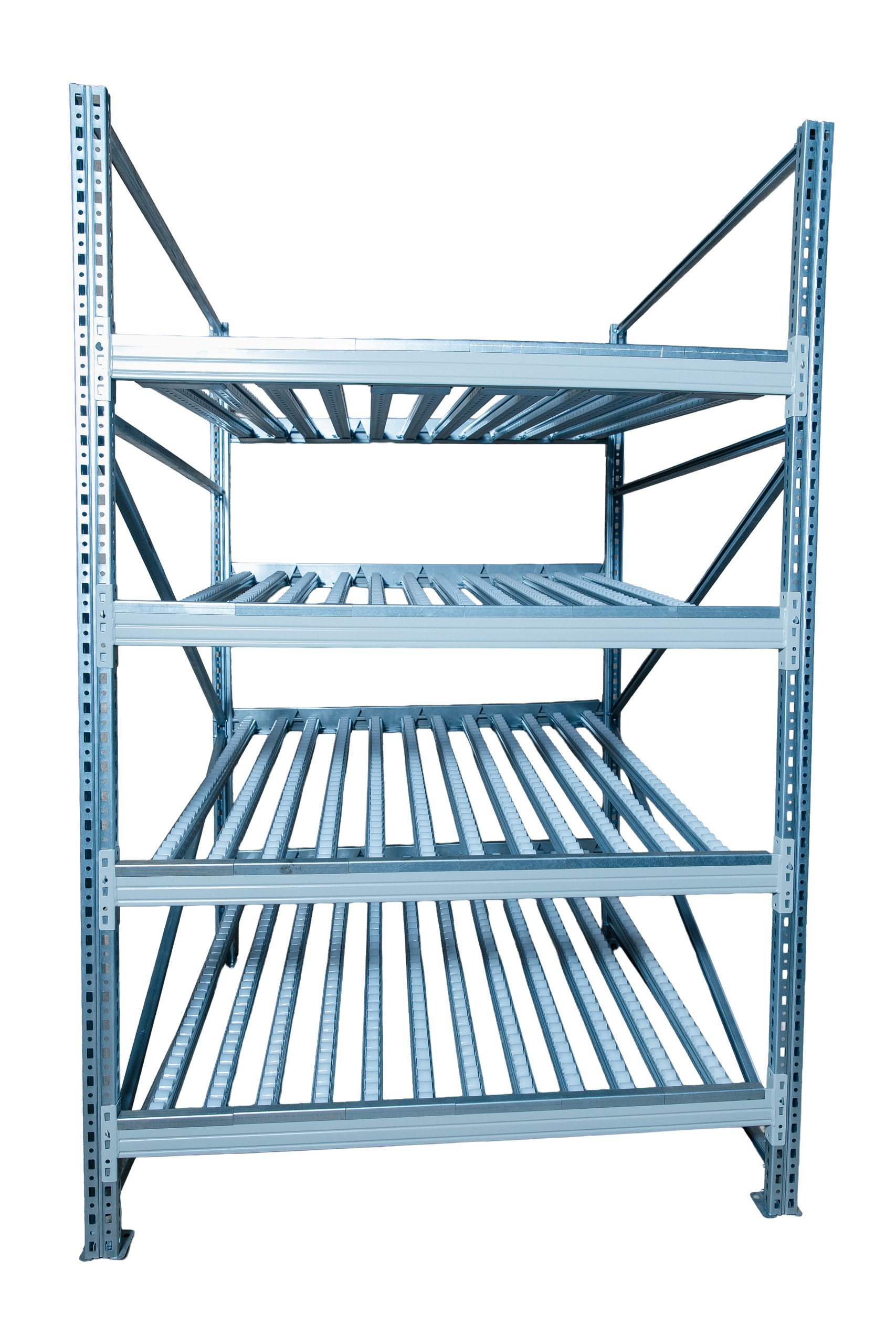 За счёт роликовых полок и наклонной подачи тары стеллаж поддерживает FIFO-принцип хранения, при котором загруженный товар последовательно перемещается к зоне отбора. Это позволяет ускорить комплектацию заказов, повысить наглядность размещения продукции и оптимизировать использование рабочего пространства.