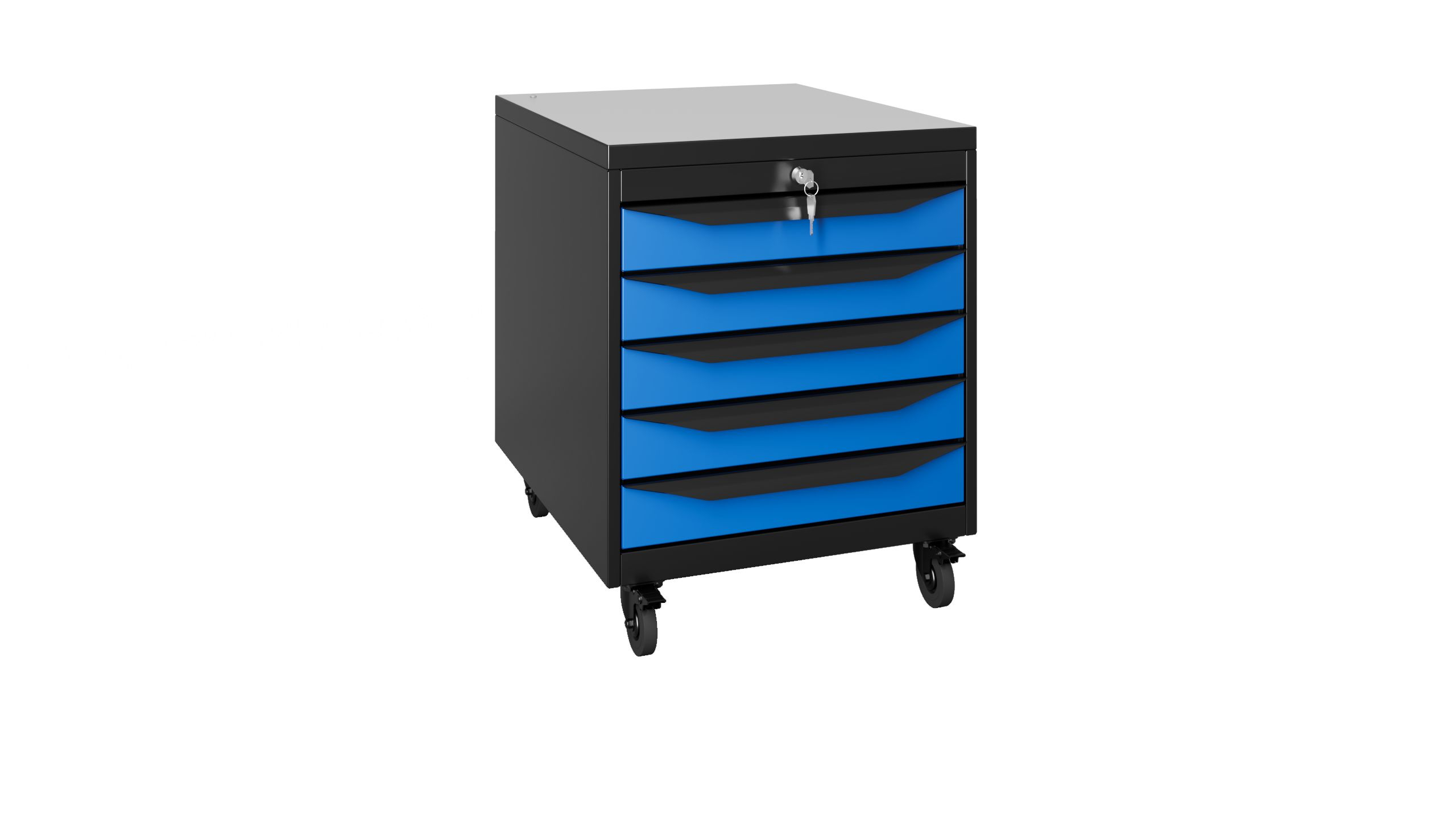 Окраска элементов корпуса осуществляется порошковой антистатической краской: RAL 9011 (темный графит), дверцы RAL 5023 (синий), столешница RAL 7047 (серый).