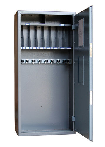 Оружейный шкаф ОШ-10АКМ предназначен для хранения десяти единиц индивидуального стрелкового оружия. Такое изделие не имеет достаточно серьезной защиты от взлома и предназначено для оборудования оружейных комнат, находящихся под дополнительной охраной.