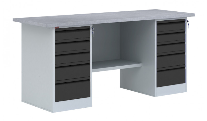 - две тумбы верстачные Т - 2Т с пятью выдвижными ящиками (нагрузка 30 кг), на телескопических направляющих, запирающимися на общий замок.